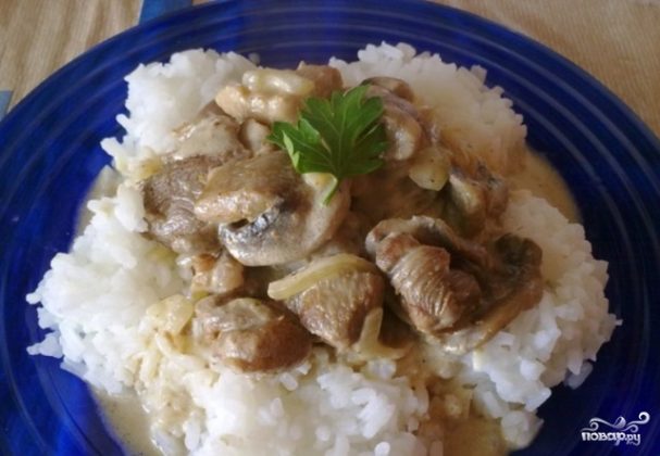 Мясо индейки, тушенное с грибами, получается очень нежным и сочным. Блюдо из категории тех, о которых говорят «пальчики оближешь». Отлично сочетается с любым гарниром, особенно вкусно с рисом.