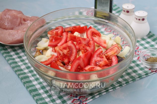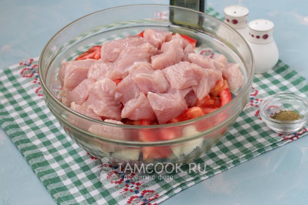 Філе індички добре промити водою та обсушити паперовими рушниками. Нарізати шматочками філе 2-2.5 см і додати до овочів.