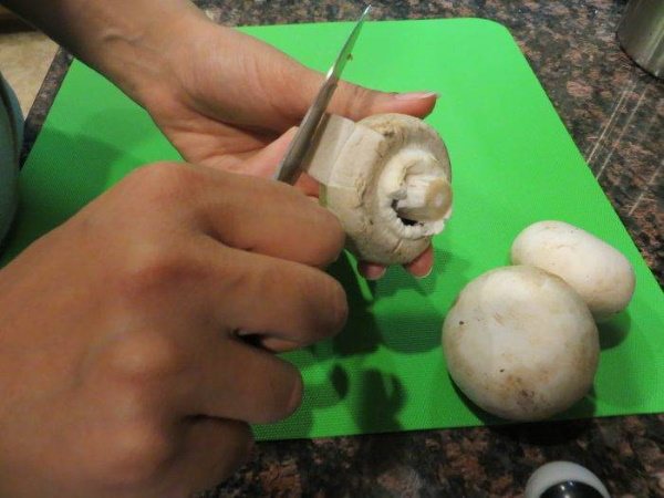 1. Гриби знадобиться позбавити від тонкої верхньої шкірки. Промивати їх при цьому не потрібно. Достатньо зрізати нижню частину ніжки. Інакше печериці здатні ввібрати в себе надто багато води.