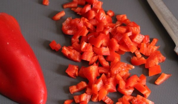2. Поки локшина наполягає, можна зайнятися іншими інгредієнтами. Спочатку потрібно дрібно порізати вибраний солодкий перець будь-якого кольору. У результаті мають вийти мініатюрні кубики овочів.