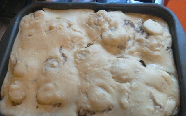 - На противне размещают свинину, на нее укладывают грибы с луком, затем – картофель (при желании слои можно поменять местами: картошку уложить на мясо, грибы – поверх картофельных кружков). Сверху все покрывают сырно-майонезной массой.