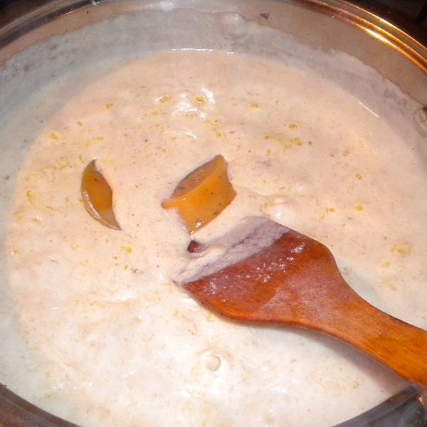 - Занимаются соусом: в кастрюльке нагревают сливочное масло, отправляют к нему муку, перемешивают. Медленно – тонкой струйкой – вливают молоко (желательно, чтобы оно было кипяченым). При этом продолжают все перемешивать, добиваясь однородности смеси. Доведя соус до кипения, убавляют огонь до минимума – проваривают еще 3 мин., солят, приправляют специями и убирают с плиты.