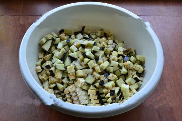 - Баклажан очищают, нарезают маленькими кубиками. Отправляют в сковороду на 5–7 мин. Слегка солят, приправляют перцем.