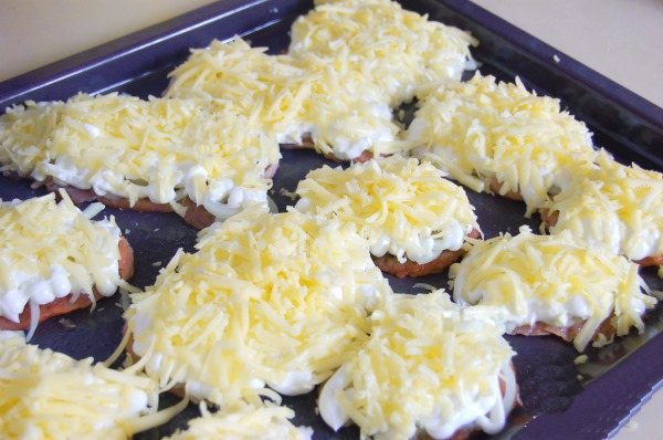 - Смешать грибы с пастой из плавленого сырка, разложить сверху.