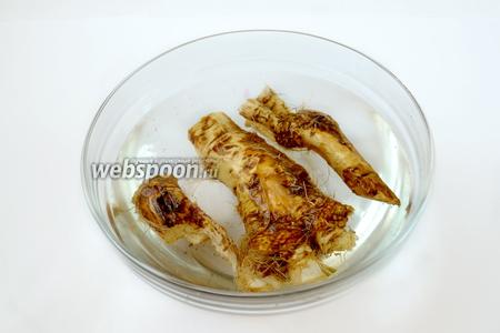 - Залейте корень водой и дайте полежать пару часов, чтобы отделилась грязь. Используйте щётку, если плод слишком грязный.