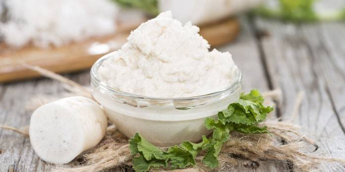 - Измельчить любым доступным способом корни в кашицу, добавить к ней соль и сахар. Хорошенько все перемешать и долить крутым кипятком до густоты сметаны.