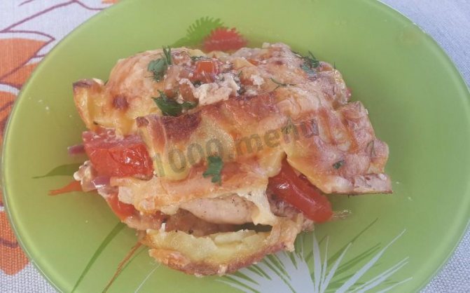 - Формочку нужно помазать маслом, положить индейку, налить заливку. Жидкость должна на ½ перекрывать филе. На каждый кусочек следует положить кружочки лука и помидора, сверху кладут кружок ананаса.