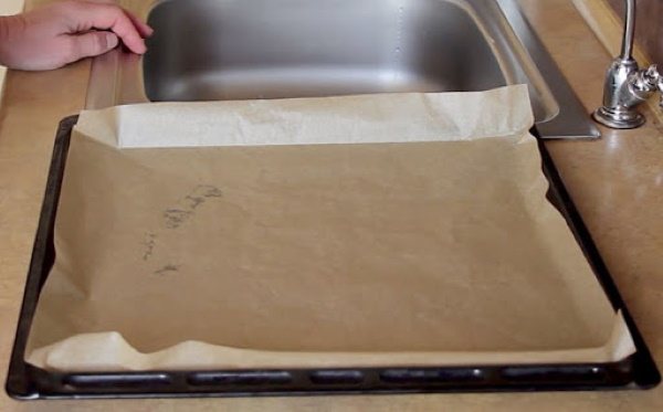 - Сначала необходимо подготовить форму для выпекания. На нее стелют коврик из силикона или пергаментную бумагу.