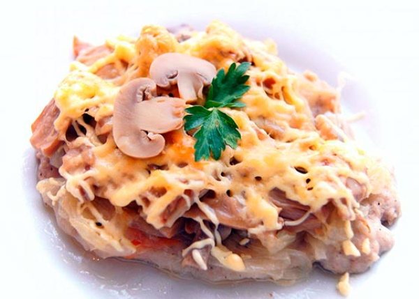 Мясо по-французски из индейки, рецепт с грибами.