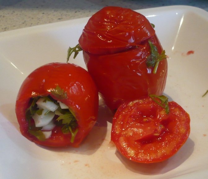 4.Дальше наполните всю емкость помидорными половинками. Сверху на них положите оставшуюся норму лука и петрушки.