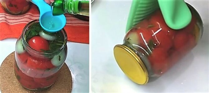 7.Пока маринад варится, слейте с банок воду и залейте помидоры кипящим рассолом. В каждую литровую банку налейте по половине чайной ложки уксусной эссенции и по столовой ложке подсолнечного рафинированного масла.
