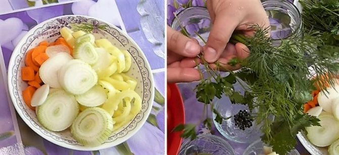 1.Помойте банки, крышки и продукты. Морковь и лук порежьте кружочками, перец — колечками. Если чеснок крупный, разрежьте его напополам, мелкие зубчики можно оставить целыми. Зелень тщательно вымойте от песка и земли.