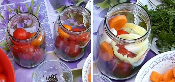 3.Уложите томаты до середины банки. Сверху положите по два кружочка лука, моркови и перца.