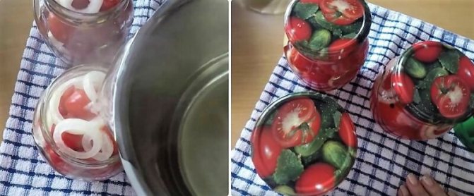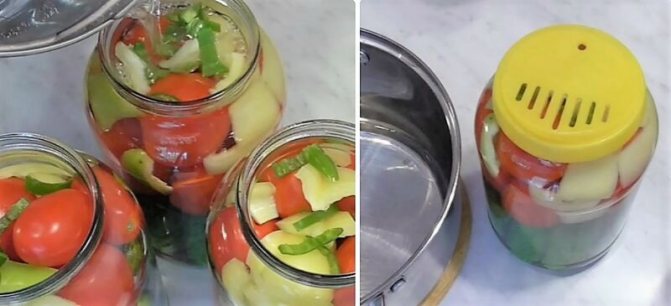3.Залейте кипятком овощи, накройте стерилизованными крышками и оставьте на полчаса. Через 30 минут слейте воду в раковину, она больше не понадобится. При этом у вас уже должна закипать новая порция воды.