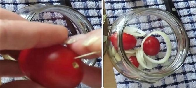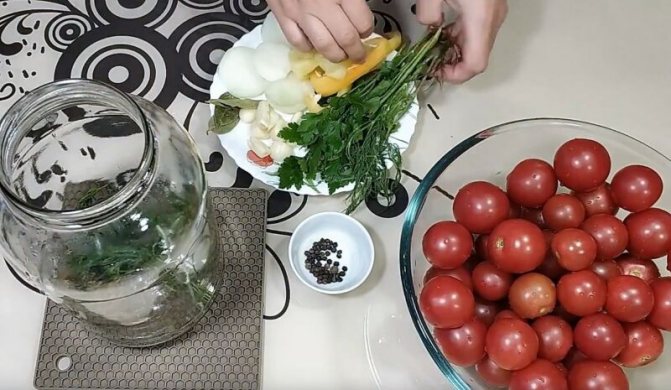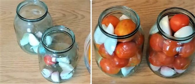 1.Все продукты и тару помойте и просушите. Чеснок и лук очистите. На дно 0,5 л банки положите зубчик чеснока, порезанный кусочками. Помидоры наколите иголкой в нескольких местах вокруг плодоножки и сложите в стеклотару.