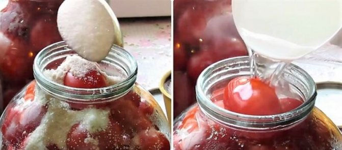 2.Залейте кипятком томаты и дайте им прогреться под крышками в течении 15 минут. После этого воду слейте в кастрюлю и добавьте необходимое количество сахара и соли.