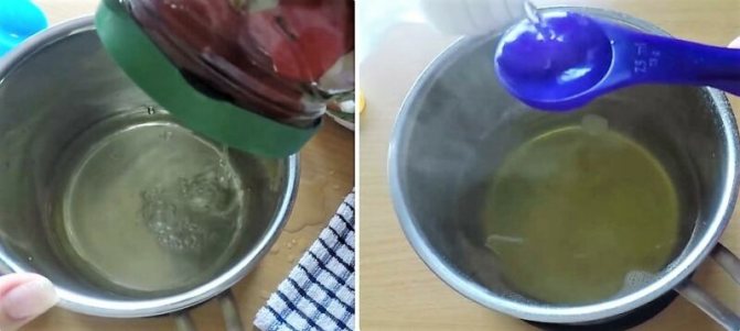 8.Теперь нужно сварить на основе этой жидкости маринад. На каждую трехлитровую банку всыпьте 6 ложек сахара и 2 ложки соли, доведите до кипения рассол.