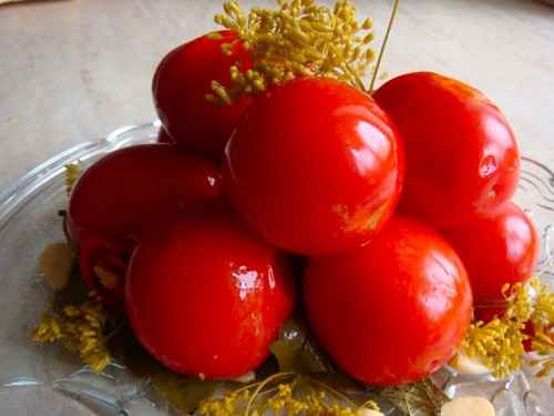 Приготовление: делаются они быстро, просто, а результат потрясающий. Помидоры бланшируются, очищаются от кожицы и укладываются в кастрюлю, затем на них посыпается слой нарезанного укропа и выдавливается чеснок. Все это заливается теплой (чуть теплее комнатной температуры) соленой водой. Помидоры готовы за один день.