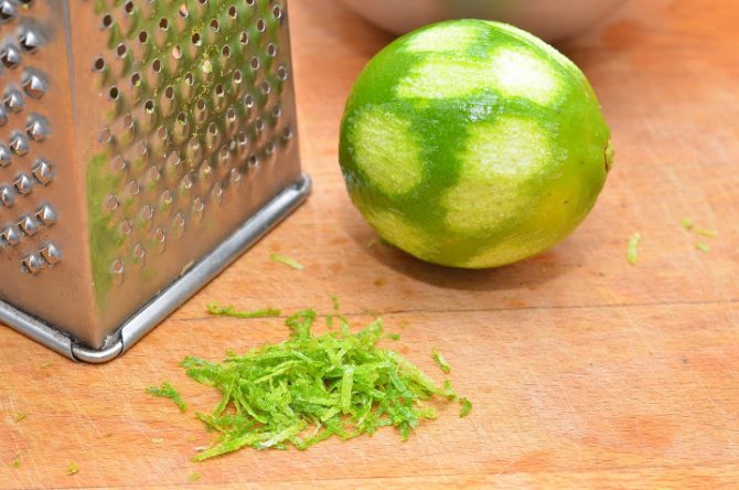 3. Лайм сполоснути у гарячій воді, використовуючи губку, щоб повністю прибрати парафін. Цедру зняти великою стороною терки, та якщо з м’якоті видавити сік, розділивши плід навпіл.
