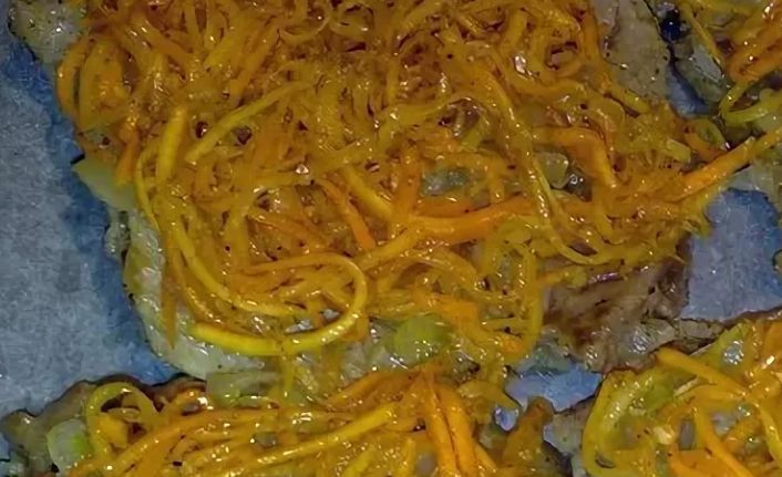 9. Підготувати великі квадрати із фольги. Кожен покласти по котлеті свинячий на кістки, потім — моркву по-корейськи і загорнути.