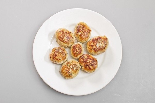 Крок №6. Які подальші дії? Фарш, що трохи охолодився, розділяємо на частини. Робимо маленькі котлетки. Кожну з них пануємо у борошні. Обсмажуємо в сковороді, додавши топлену олію. Як тільки котлети покриються рум’яною скоринкою, вимикаємо вогонь. Наше приготування не закінчується.