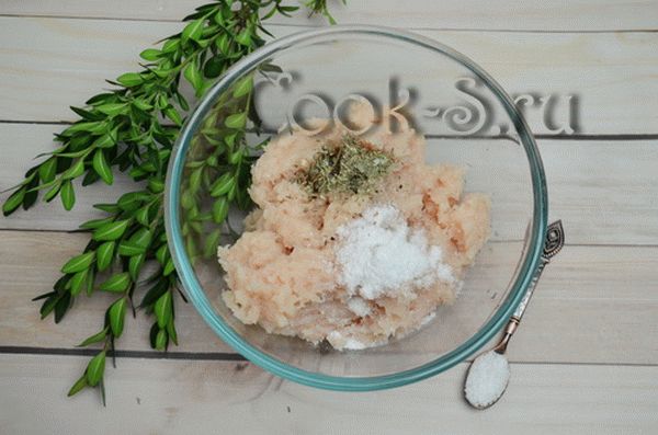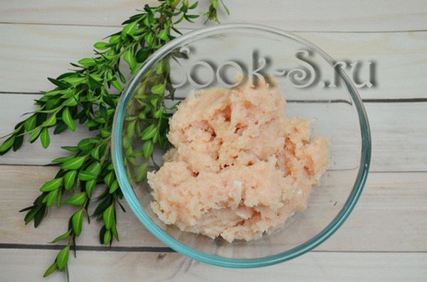 4. Куряче філе перемелити м’ясорубкою. Додайте сіль, присмажити перцем і добре вимісити, злегка відбийте об стіл.