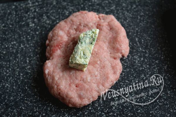 3. З фаршу виліпіть довільного розміру кульки. У центр кожного помістіть шматочок змішаного з кропом олії та сформуйте котлети.
