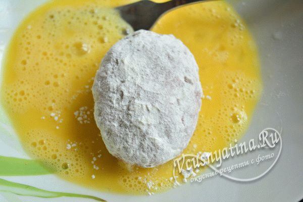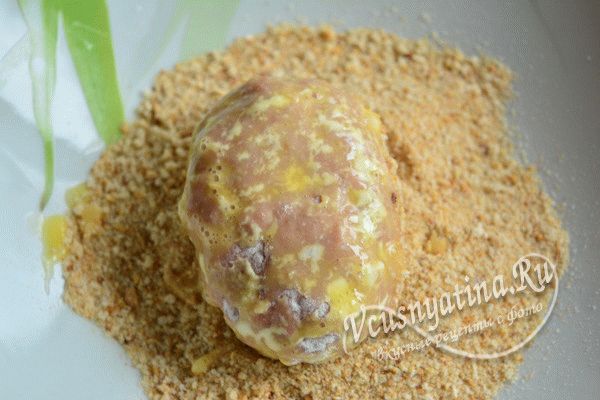 5. Перемішати віночком яйце. Вмочити в нього заготівлю, потім відправити в сухарі та поваляти з усіх боків. Повторити ще двічі.