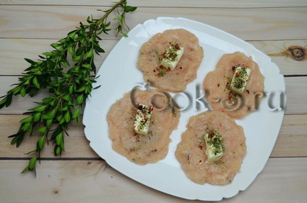 3. З курячого фаршу виліпите овальні коржі, трохи тонше сантиметра і помістіть на середину кожної брусочок олії. Поверх викладіть платівку сиру, зведіть краї та заліпіть їх. Руками надайте заготовці овальну форму, злегка притискаючи долоньками до фарш до начинки.