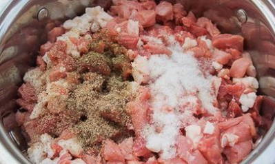 - Далі продукти пропускаємо через м’ясорубку. В отриманий фарш додаємо сіль та спеції.