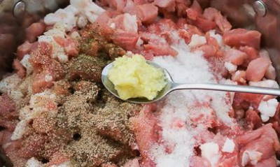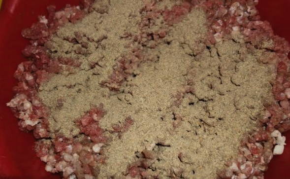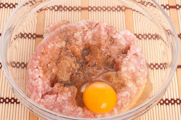 - Коли фарш буде готовий, у миску з м’ясом потрібно помістити всі підготовлені інгредієнти, додати вибрані спеції та 100 мл чистої кип’яченої води.