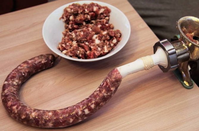- Занурюємо м’ясну заготівлю в наперед промиту кишку. Робити це можна за допомогою м’ясорубки.
