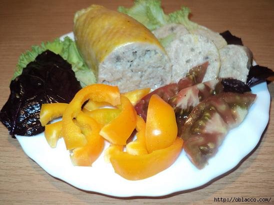 Усі складові, за винятком шинки, слід викласти в хащі блендера і змолоти до повної однорідності. Шинку потрібно нарізати кубиками розміром по півсантиметра з кожного боку, додати їх до решти маси і ретельно перемішати. Викласти отриману масу на лист пергаменту, згорнути у формі ковбаси і дуже щільно закрутити, причому кілька шарів, і перетягнути шпагатом або нитками. Покласти ковбасу у відповідного розміру каструлю, повністю залити водою і варити протягом 25 хвилин. Остудити ковбасу на ґратах і поправити в холодильник на ніч. опублікував Сергій Кузнєцов на сайті МИРТЕСЕН