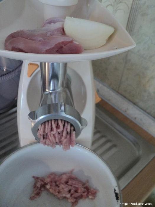 Зняти з кістки м’ясо, очистити цибулю та перекрутити на м’ясорубці.