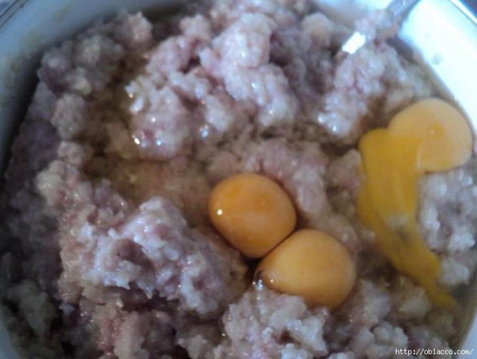 - У глибокій ємності потрібно змішати курячі яйця, фарш, сіль та перець.