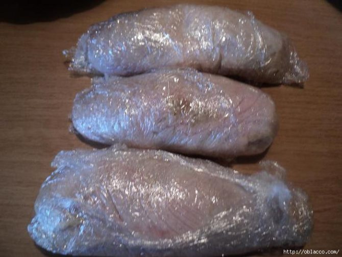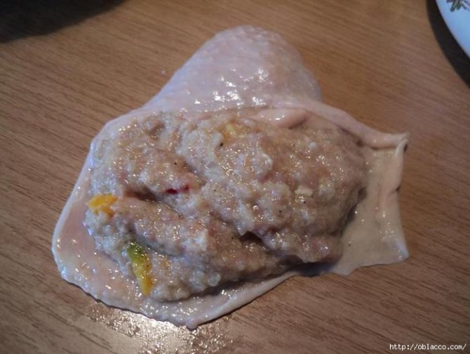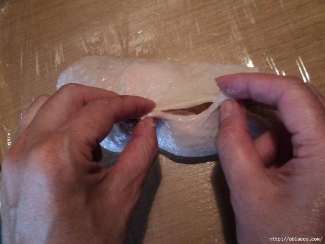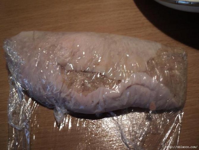 І акуратно загорнути у плівку. Коли збираєтеся фарширувати, шкіру відразу для зручності покладіть на плівку, я відразу не зрозуміла це зробити.
