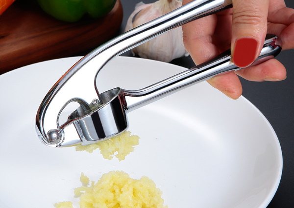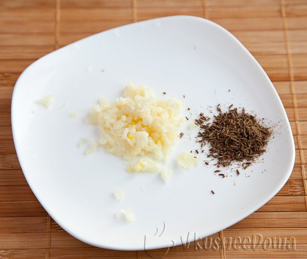 - Сюди ж продавлюємо очищені зубчики часнику.