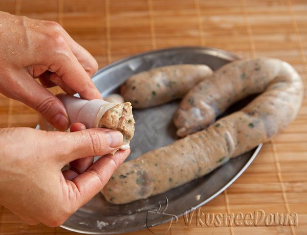 Через кожні 8-10 см перев’язуємо кишку ниткою – виходять ковбаски.