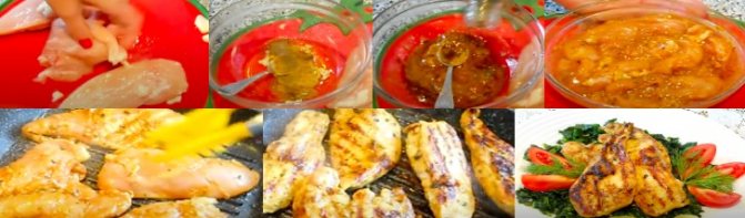 Из куриных грудок делаем равные по толщине куски филе, удалив кости. Смешиваем все ингредиенты для маринада куриной грудки и тщательно обрабатываем каждую. Оставляем все это на час при комнатной температуре.