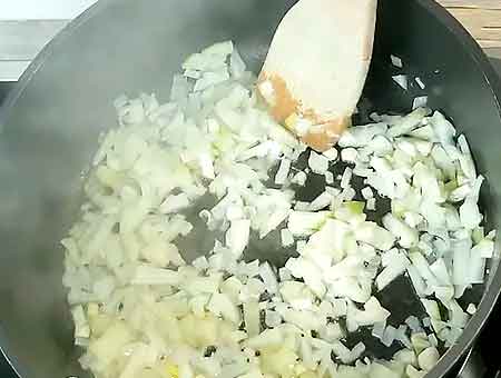 • Ріжемо цибулю з часником, обсмажуємо на сковороді, з олією