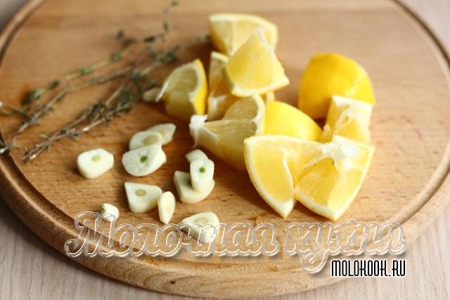 - Іншу половину лимона порізати на 8-12 частин, а часник, що залишився, – кружальцями.