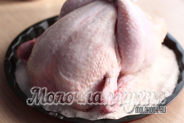 Курка обвалюється в суміші, що вийшла так, щоб сіль, немов шубка, обволокла кожну ділянку птиці.