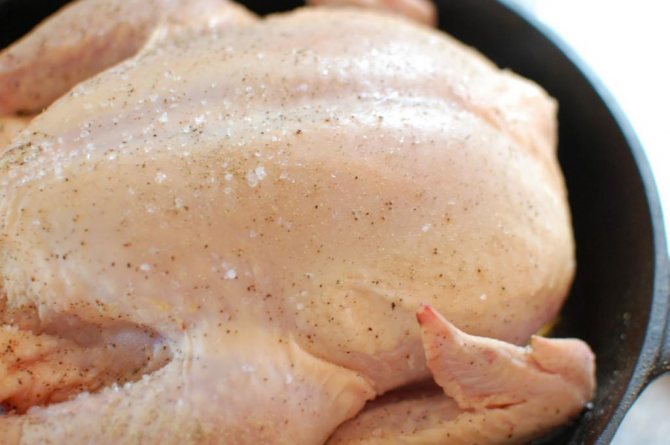 - Перед приготуванням птах повинен бути повністю розморожений і насухо витертий. Це допоможе уникнути надмірного виділення вологи і, як наслідок, прилипання солі до курячої шкіри. Якщо це сталося, цю ділянку шкірки краще відразу зняти ножем і викинути.