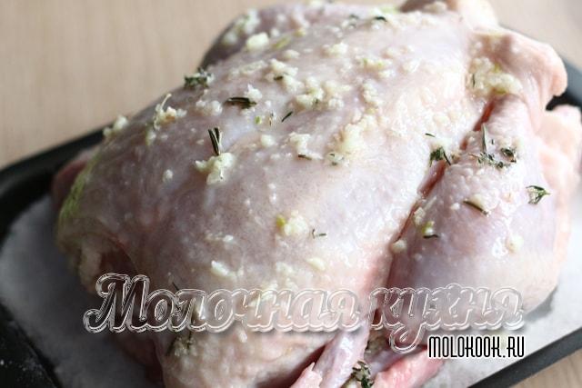 - М’ясо можна змастити розм’якшеним вершковим маслом, змішаним із зеленню або спеціями. Для цього потрібно акуратно підняти шкірку, намагаючись її не пошкодити, і розподілити ароматну масляну суміш рівномірним тонким шаром. Вийде ще соковитіше.