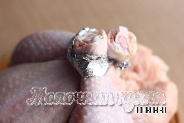 - Щоб у процесі запікання не пригоріли кінчики крил, їх слід прикрити фольгою або сховати в «кишеньки», надрізавши шкіру на бічних частинах грудки.