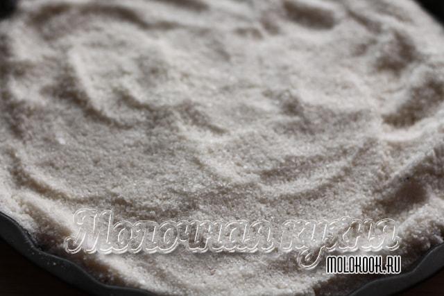 - На дно великої форми помістити аркуш пергаменту. Зверху насипати сіль – висота шару має бути не менше 2 см.