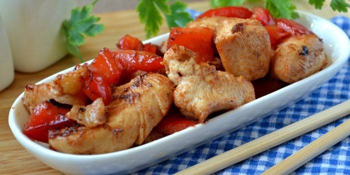 Рецепт підійде тим господиням, які не мають часу на довге приготування і для того, щоб вигадувати смачну їжу до обіду чи вечері. Курка з болгарським перцем китайською готується не більше години, а виходить фантастично смачною. Всі інгредієнти, зібрані в рецептурі, ідеально поєднуються за смаковими якостями, а ось готову страву китайською бажано подавати з гарніром, наприклад, рисом.