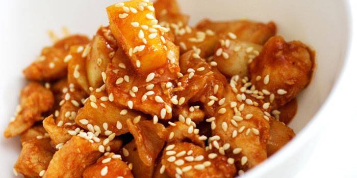 З кисло-солодким соусом з ананасами.