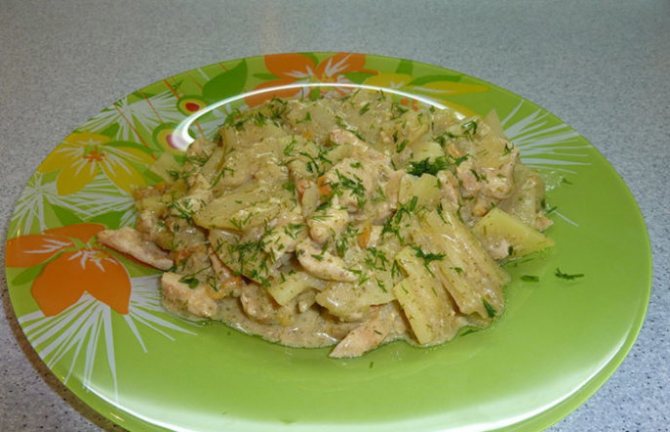 Крім грибів найкраще з куркою у сметанному соусі поєднується картопля, яку можна використовувати як додатковий компонент страви, так і як самостійний гарнір. Тим, хто обирає перший варіант із картоплею, можна порекомендувати наступний рецепт.