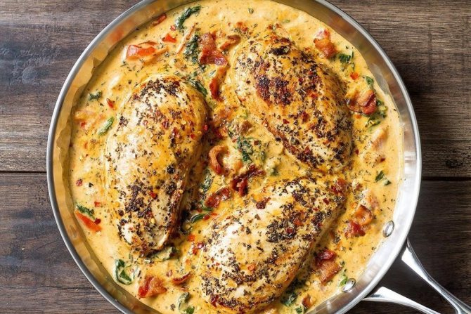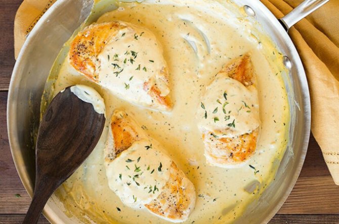 Якщо є необхідність приготувати курку швидко та смачно, варто підсмажити її у сметанному соусі на сковороді. Хитрість всього одна – нарізати філе невеликими шматочками для швидшої – швидше за 20 хвилин – теплової обробки.